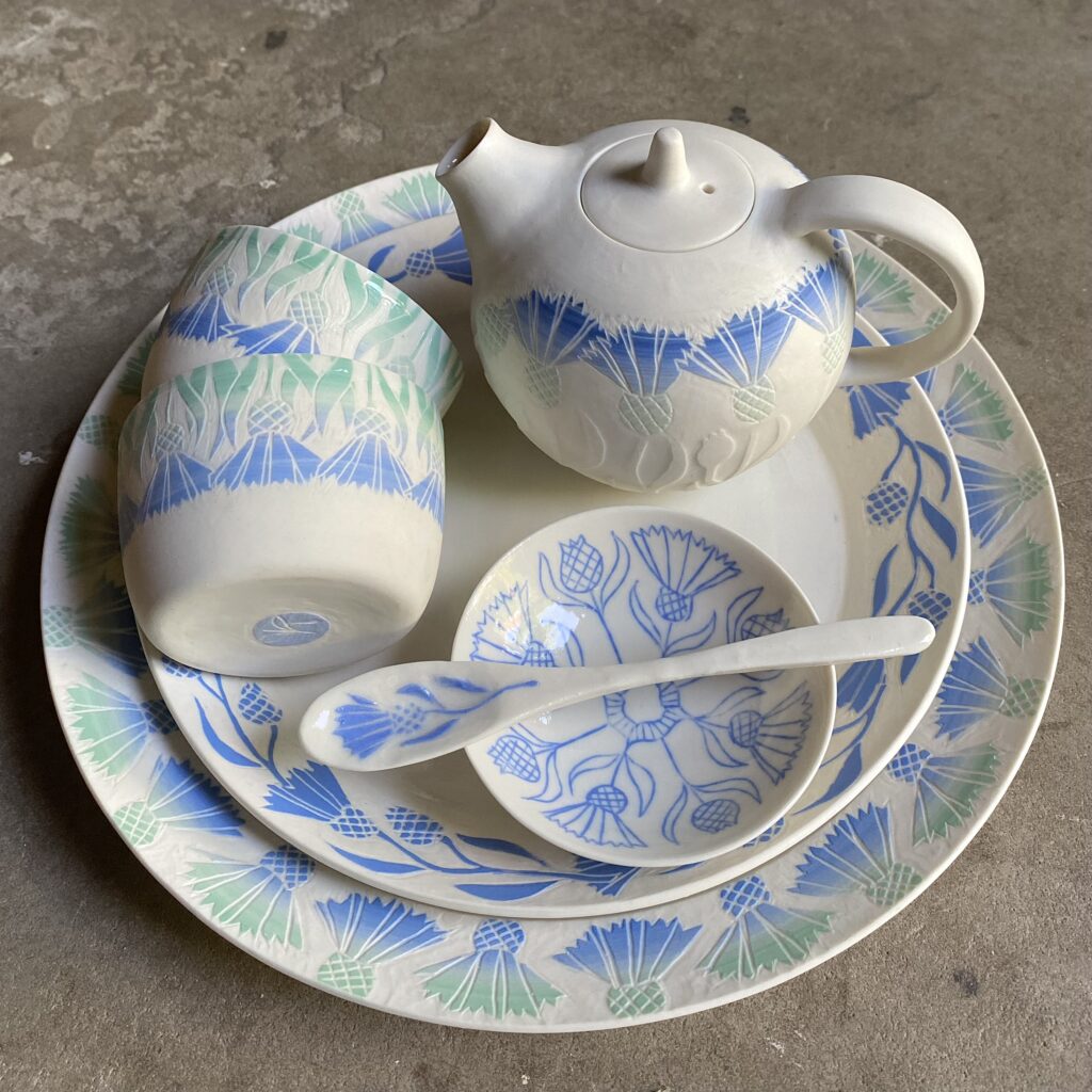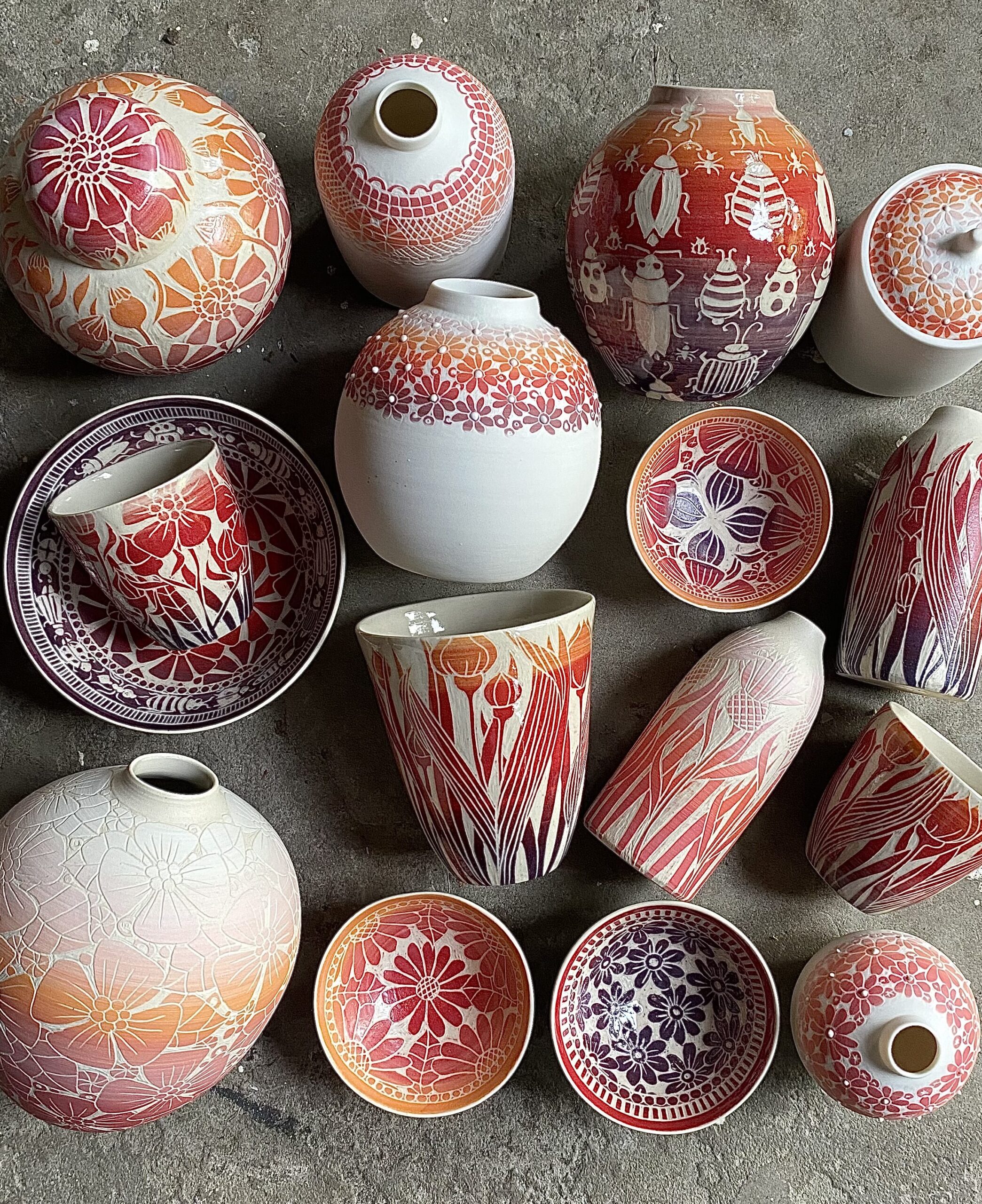 Al mijn werk wordt gedraaid op de draaischijf en kenmerkt zich door mooie kleuren en verfijnde botanische decoraties. Ik maak voornamelijk gebruik van vergrijsde kleuren en pastels die doen denken aan de jaren 50. Voor mijn decoraties laat ik mij graag inspireren door de natuur.